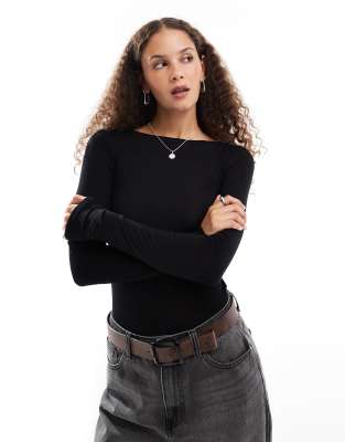 Weekday - Top nero semitrasparente a maniche lunghe in jersey morbido con scollo a barchetta