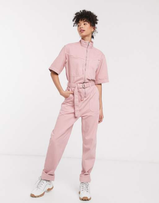 Weekday - Tuta di jeans a maniche corte rosa slavato