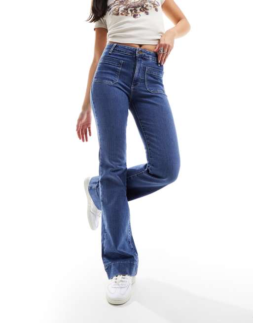 Wrangler - Pantaloni a zampa a vita molto alta blu medio con tasche sul davanti