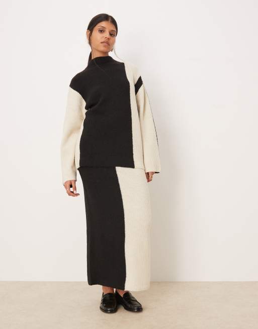 YAS - Completo in maglia crema e nera a contrasto con gonna lunga e maglione