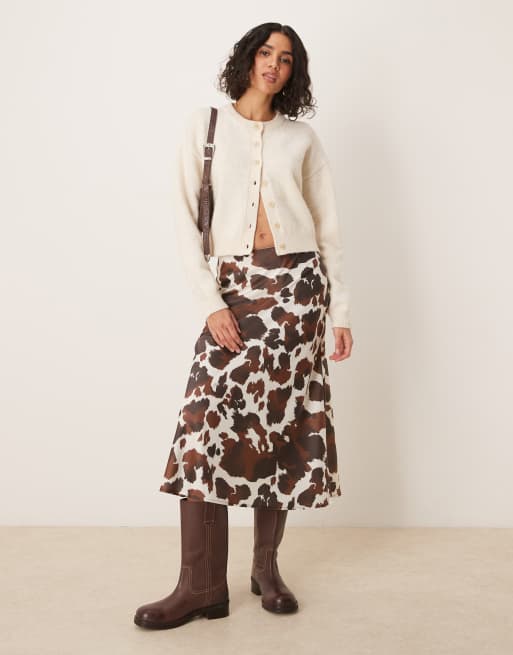 YAS - Gonna midi in raso marrone con stampa pezzata
