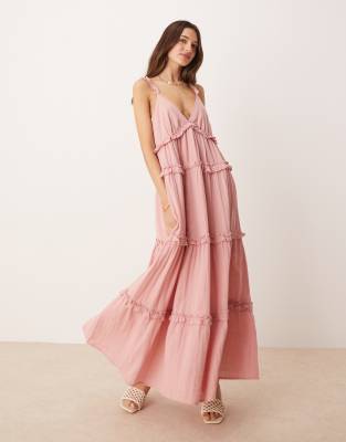YAS - Vestito lungo con spalline sottili rosa polvere con volant a balze