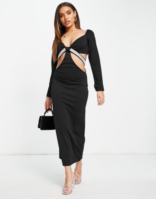 Yaura - Vestito con gonna al polpaccio nero con fascia con strass e cut-out