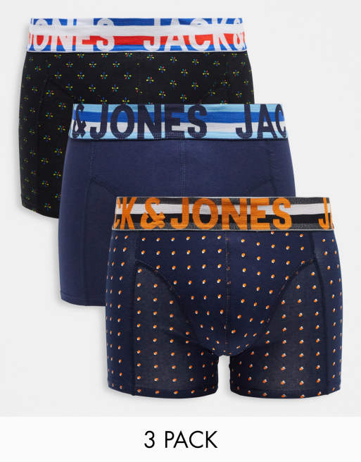 Jack & Jones 3 pack trunks in spot & geo design in navy & black