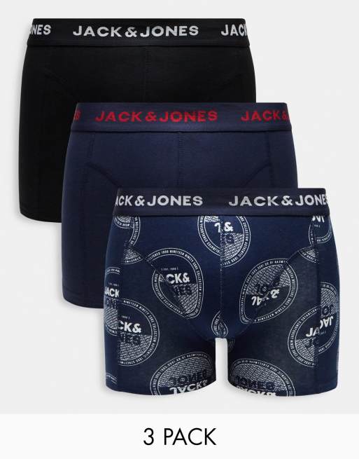 Jack & Jones 3 pack trunks with logo print in navy & black