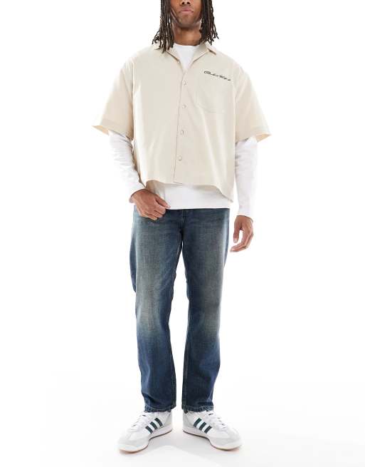 - Stretch denim: mid-blue wash