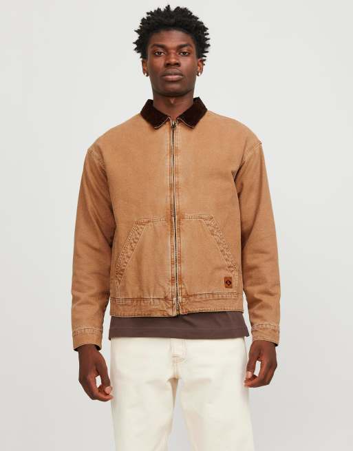 Jack & Jones denim worker jacket with cord collar in tan