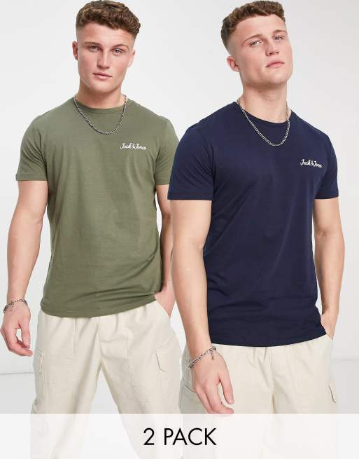 Jack & Jones Essentials 2 pack t-shirts with script chest logo in navy and khaki