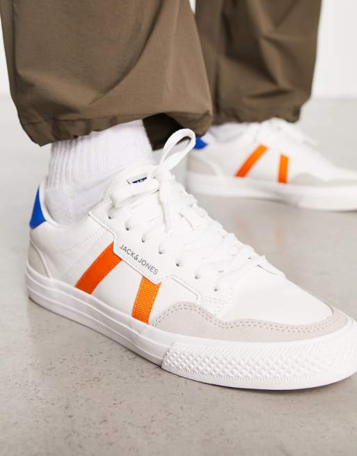 Jack & Jones faux leather trainer with contrast orange panel in white