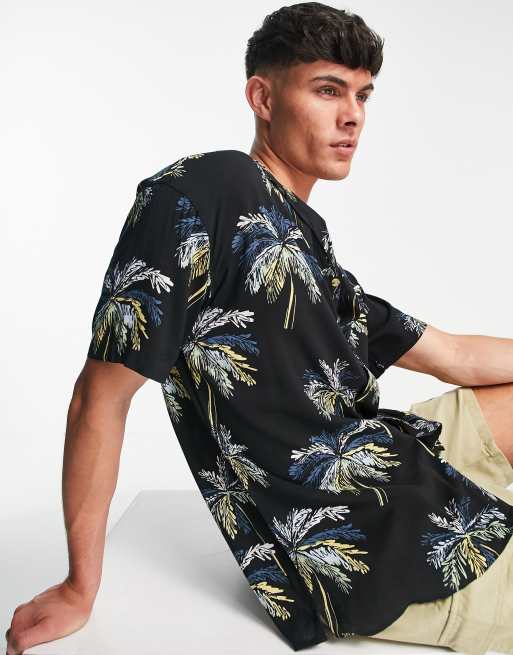 Jack & Jones Originals revere collar shirt in black palm tree print
