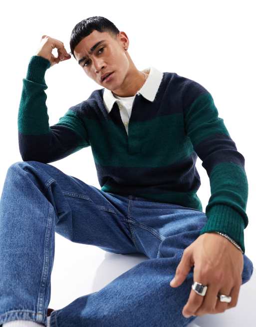 Jack & Jones Premium knitted rugby polo in navy & green