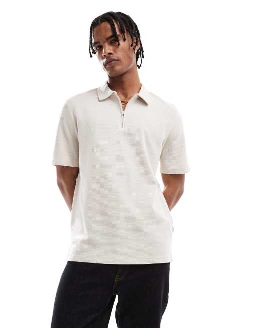 Jack & Jones textured zip polo in beige