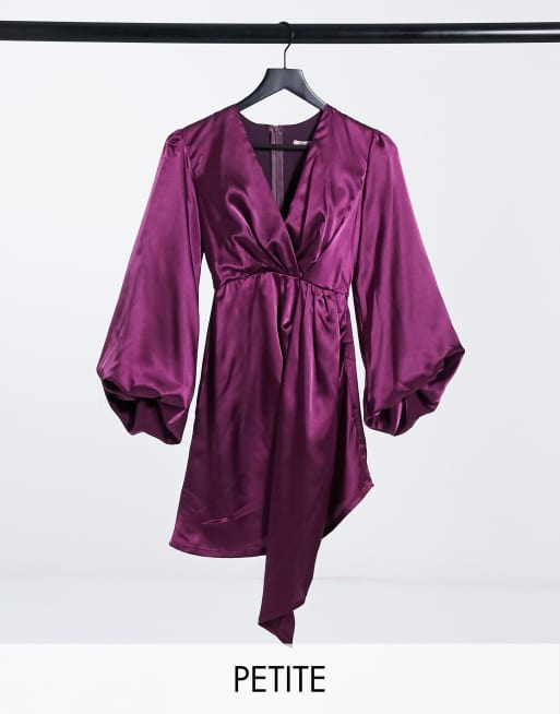 Jaded Rose Petite exclusive plunge satin mini dress with balloon sleeve and train detail in plum