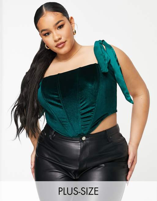 Jaded Rose Plus exclusive tie shoulder velvet corset top in emerald green