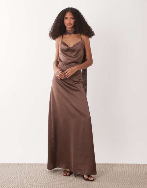 JDY cowl neck satin maxi dress with open back and scarf in brown