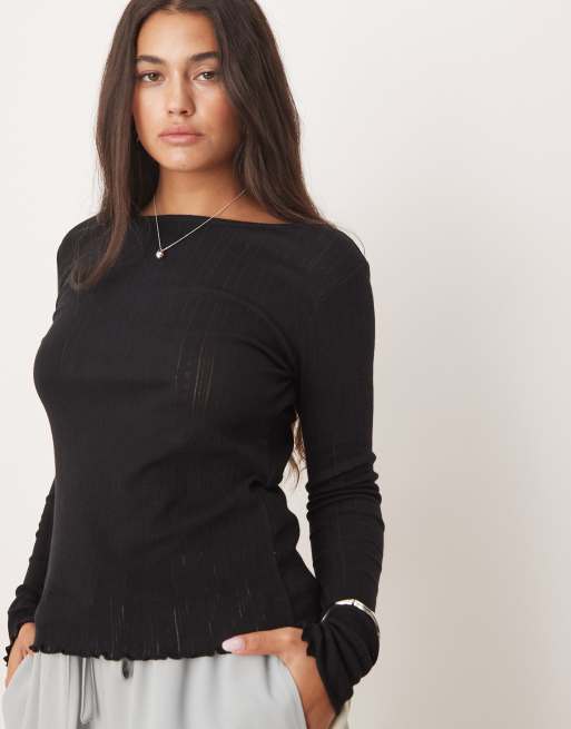 JDY lettuce edge long sleeve boatneck top in black