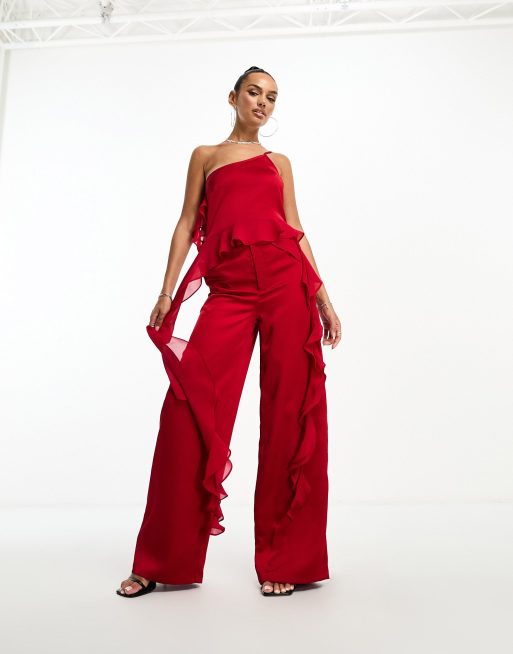 Kaiia exclusive chiffon ruffle wide leg trouser co-ord in red