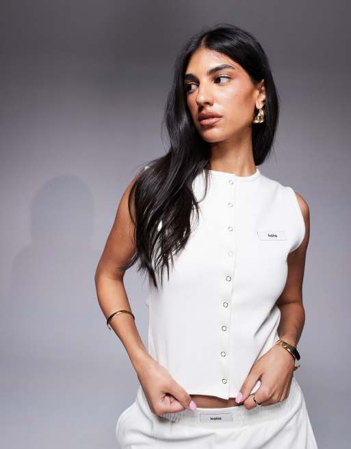 Kaiia exclusive cotton blend sleeveless cropped button through vest top co-ord in cream