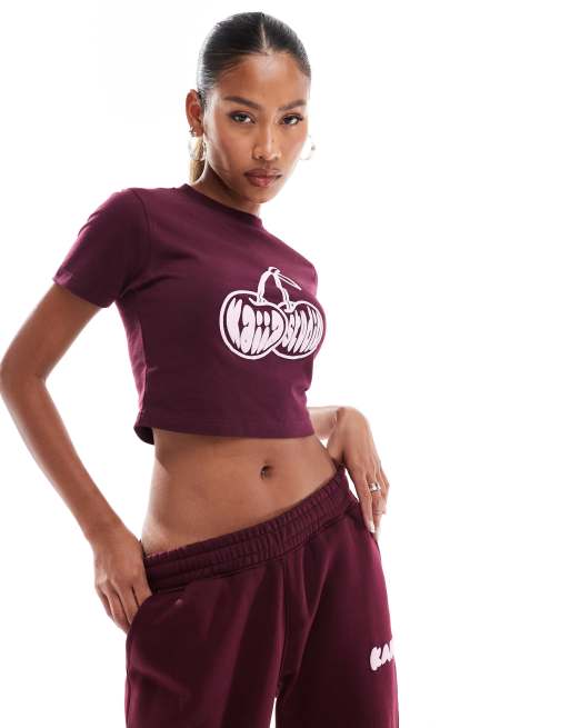 Kaiia exclusive cotton rich cropped cherry motif baby tee co-ord in burgundy