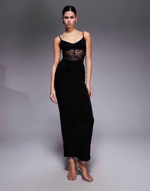 Kaiia exclusive double layered slinky lace sheer corset detail maxi dress in black