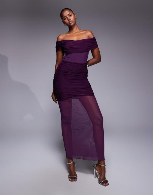 Kaiia exclusive double layered slinky off shoulder sheer mesh hem maxi dress in plum