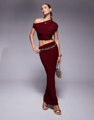Kaiia exclusive double layered slinky ruched drawstring maxi skirt co-ord in burgundy