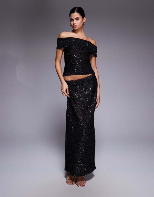 Kaiia exclusive off shoulder sequin knit top and maxi skirt co-ord in black
