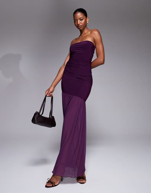 Kaiia exclusive premium slinky soft touch sheer mesh hem bandeau maxi dress in plum