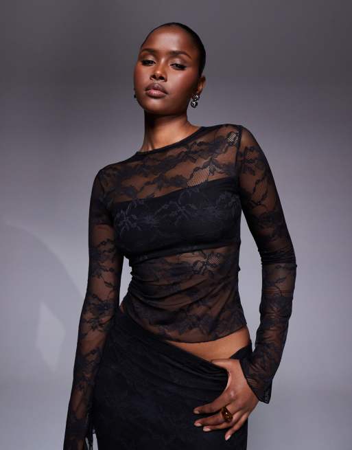 Kaiia exclusive slinky lace neck long sleeve crop top co-ord in black