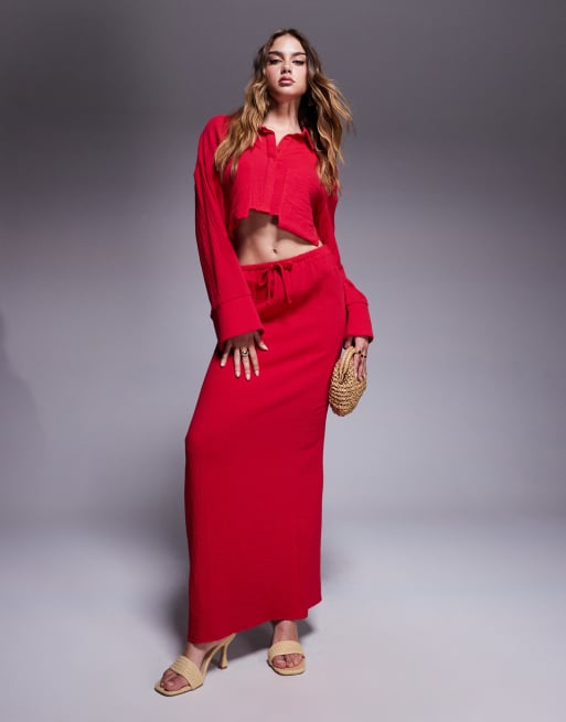 Kaiia exclusive textured cotton drawstring maxi skirt co-ord in red
