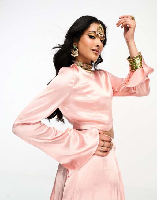 Kanya London Bridesmaid Lehenga long sleeve crop top in peach