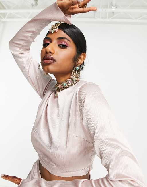 Kanya London Bridesmaid Lehenga long sleeve crop top in pink