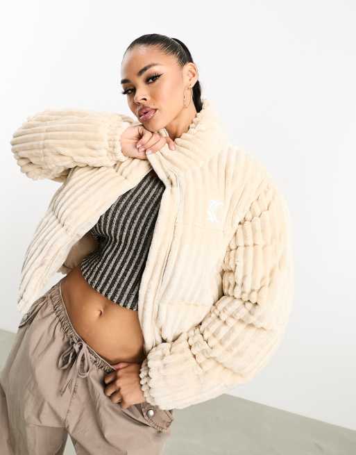 Karl Kani retro cropped puffer jacket in beige corduroy
