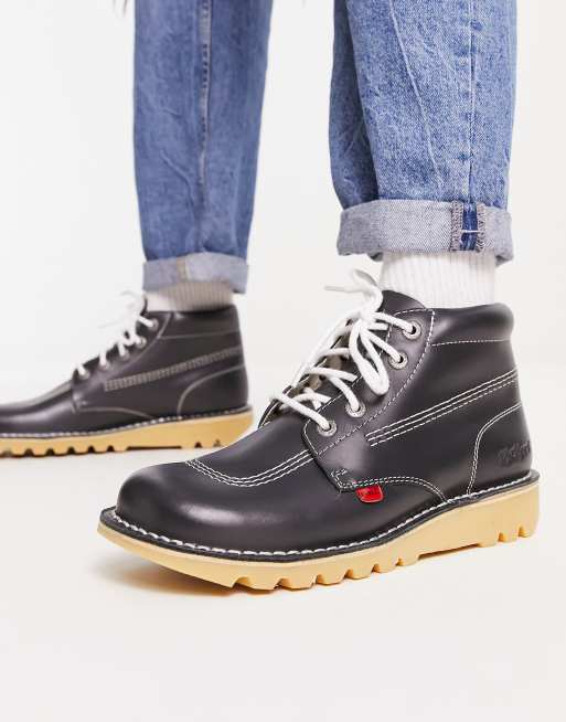 - French designed youth brand Kickers saw a resurgence in popularity when they were adopted by the rave scene of the early 90s. With their distinctive tough crepe soles and nubuck leather uppers, classic Kick-Hi boots replace the trainer as the distinctive casual shoe of choice.