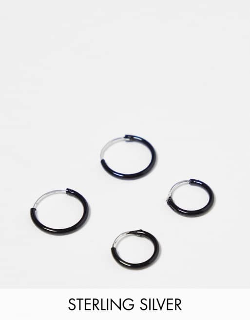 Kingsley Ryan black coated 10 and 12mm hoop earrings pack in sterling silver