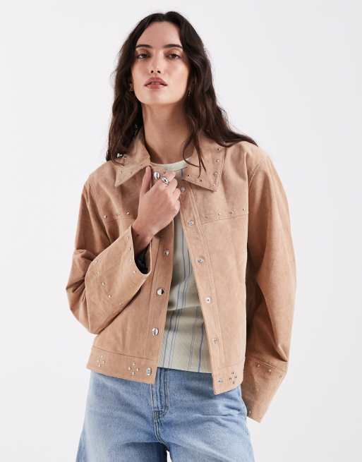 Laagam luana real suede button down jacket in taupe co-ord