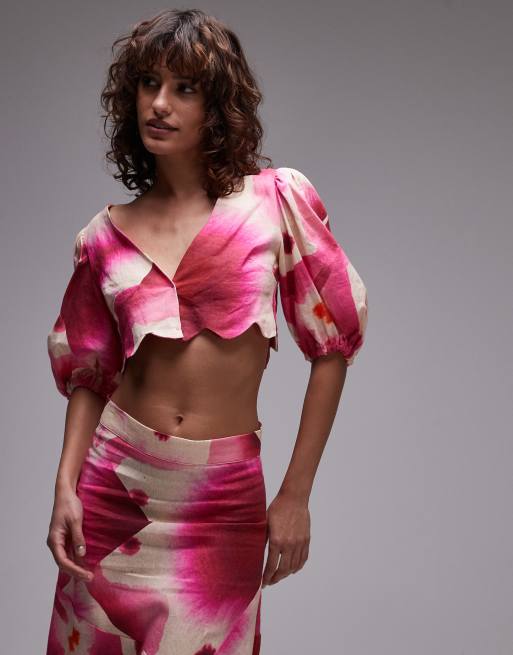 LAAGAM rose puff sleeve crop top with scallop edging in pink co-ord