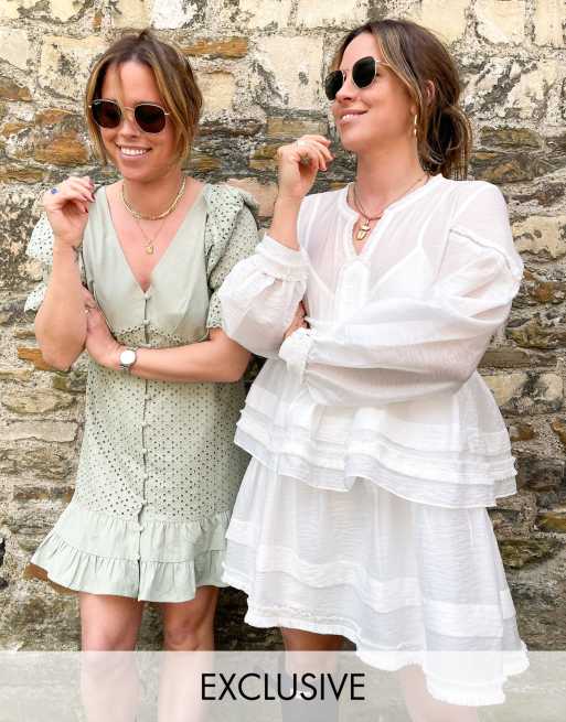 Labelrail x Collyer Twins button through mini dress with ruffle shoulder in broderie