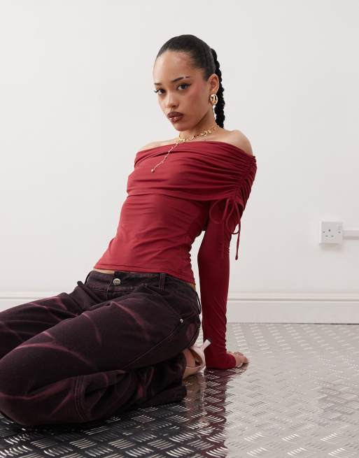 Labelrail x Jennifer McKing liquid off-shoulder long sleeve top in burgundy