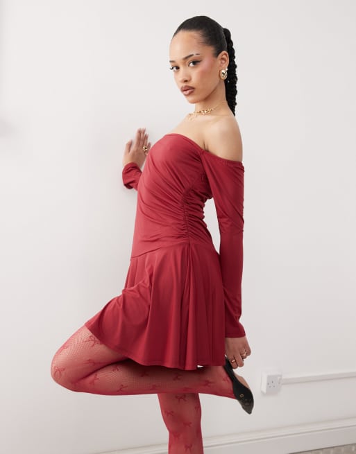 Labelrail x Jennifer McKing slinky ruffle off-shoulder mini dress in burgundy