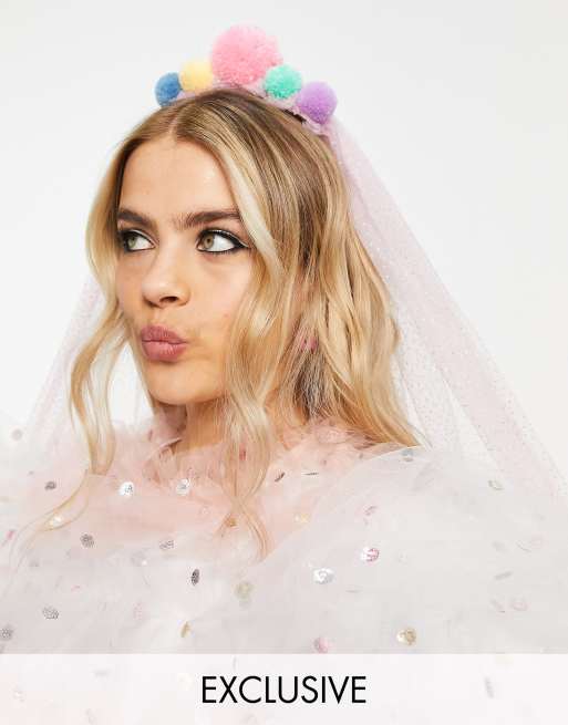 Labelrail x Rachel Burke pom pom detail comb head band with glitter veil in multi