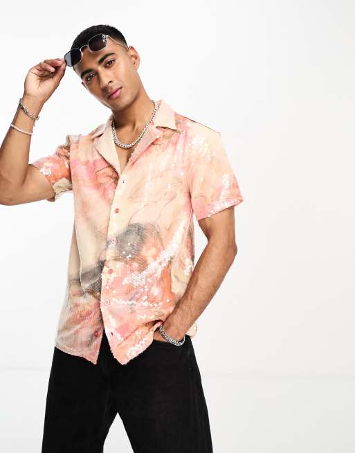 Labelrail x Stan & Tom revere collar marbled print sequin short sleeve shirt in multi