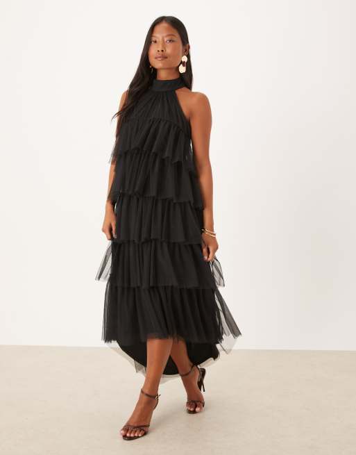 Lace & Beads Petite backless tiered tulle maxi dress in black