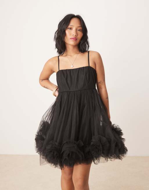 Lace & Beads Petite bubble hem babydoll micro mini dress in black