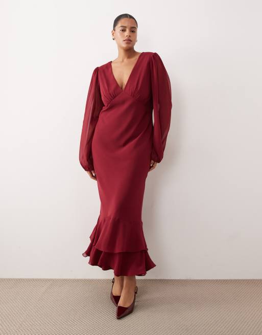 Lace & Beads Plus chiffon balloon sleeve plunge neck ruffle hem maxi dress in burgundy