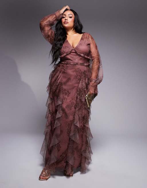 Lace & Beads Plus long sleeve ruffle maxi dress in brown animal print