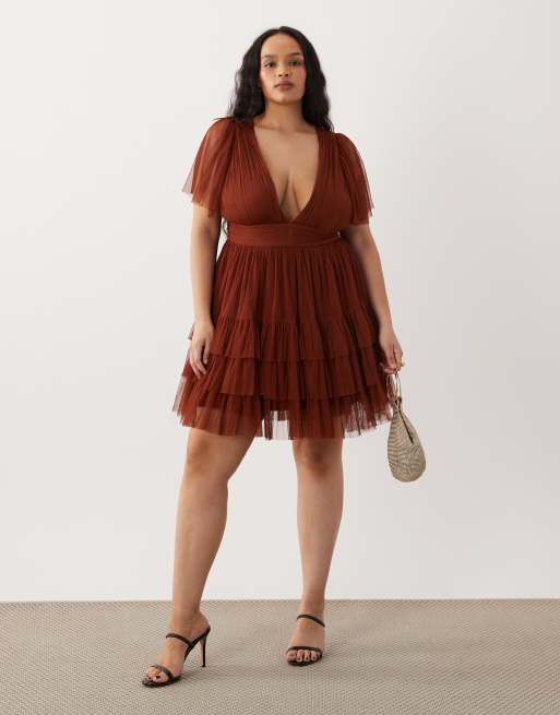 Lace & Beads Plus v neck ruffle skirt mini dress in rust