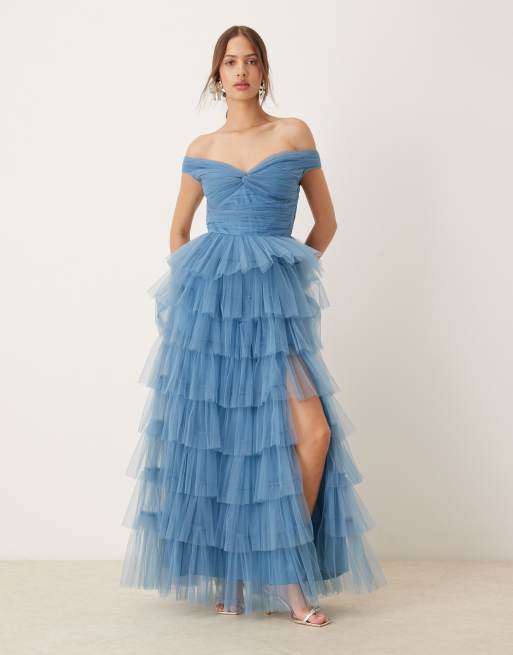 Lace & Beads bardot tulle maxi dress in blue