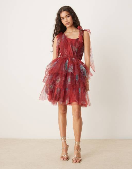 Lace & Beads bow shoulder ruffle mini dress red floral