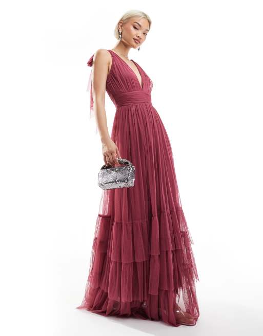 Lace & Beads Bridesmaid bow shoulder tiered maxi dress in orchid